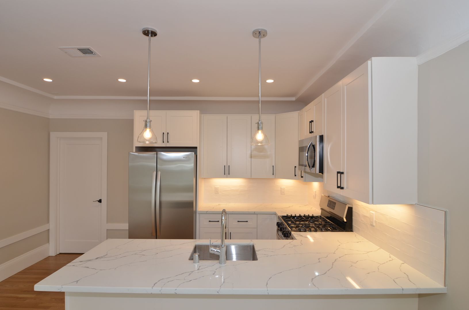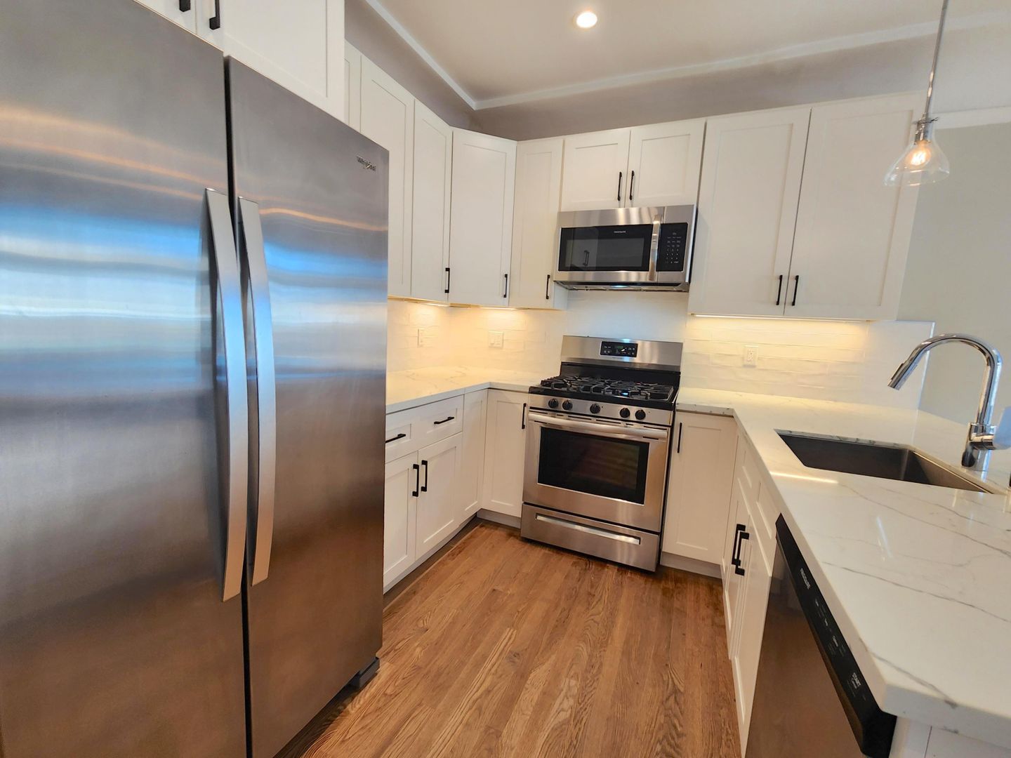 • Modern kitchen with white cabinetry, quartz countertops, glass tile backsplash, under cabinet lighting, new fixtures, stainless appliances including fridge, micro-hood, gas stove, and dishwasher