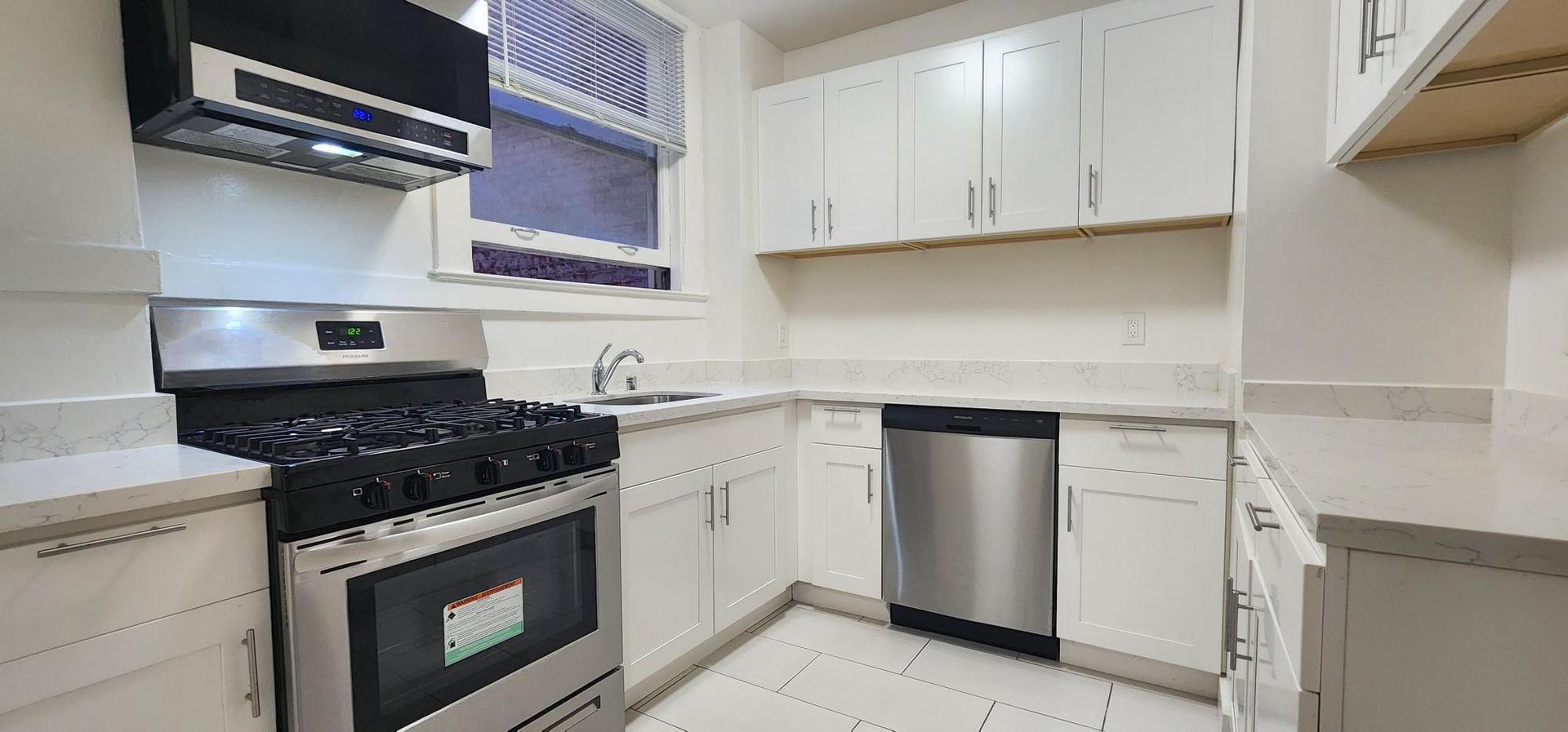 * All-stainless contemporary appliances including gas stove, microwave, refrigerator, dishwasher